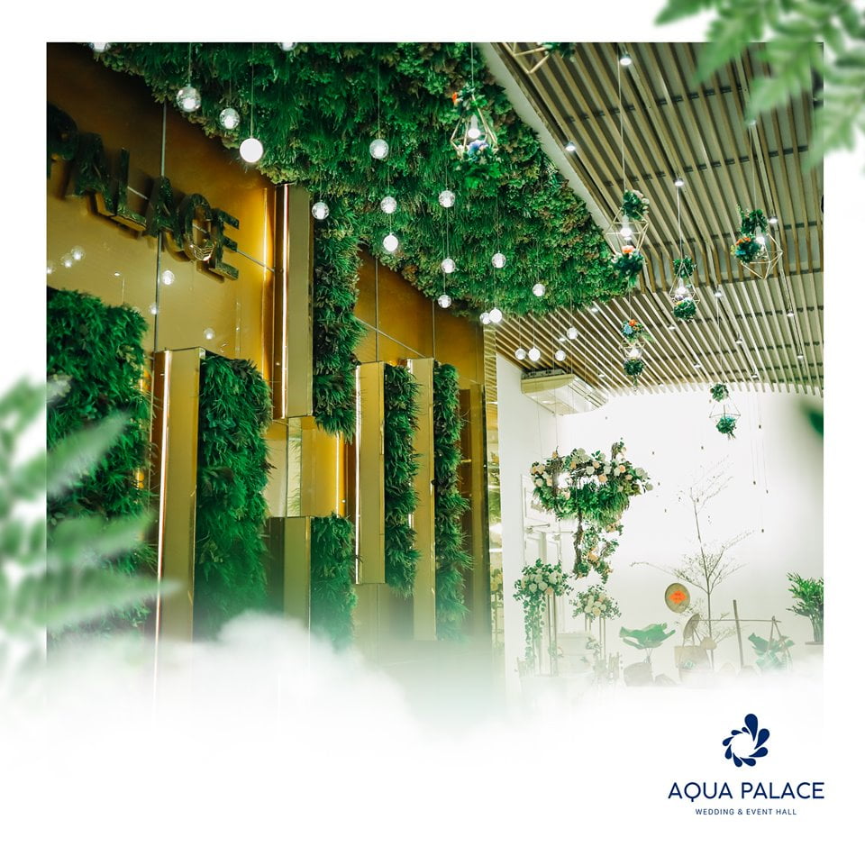 Hiểu được điều đó, Aqua Palace tự hào với chất riêng mang “không khí sân vườn” vào trong sảnh. Không gian tổ chức buổi tiệc thoáng đãng, với phong cách trang trí màu xanh làm chủ đạo chắc chắn mang lại sự thoải mái cho quan khách tham dự buổi tiệc chúc phúc của hai bạn.