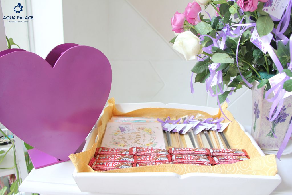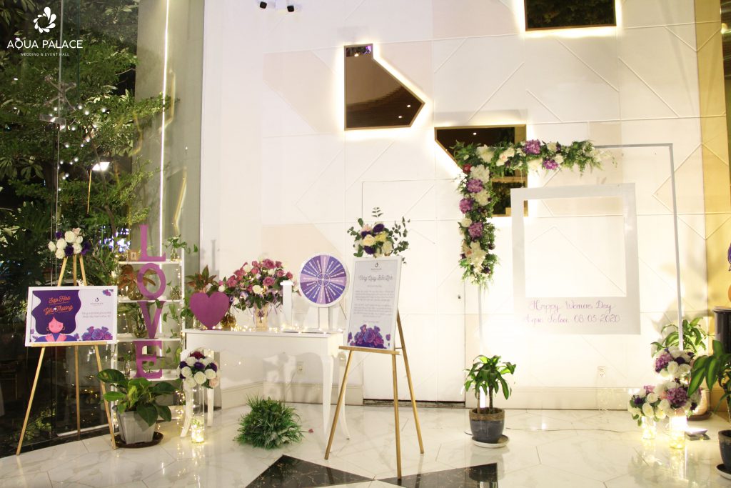 Ngay tại cửa chính, bao trùm một khoảng không gian là sắc tím mộng mơ thu hút ánh nhìn của mọi vị khách đến dự tiệc. Aqua Palace lựa chọn tone màu này bởi sự nhẹ nhàng, lãng mạn mà không kém phần quý phái như tượng trưng cho vẻ đẹp của phái nữ. Nổi bật vào ban ngày và lung linh vào ban đêm chính không chỉ diễn tả vẻ đẹp của SẠP HOA YÊU THƯƠNG mà còn là lời chúc Aqua Palace muốn gửi đến ‘’ nửa kia của thế giới’’.