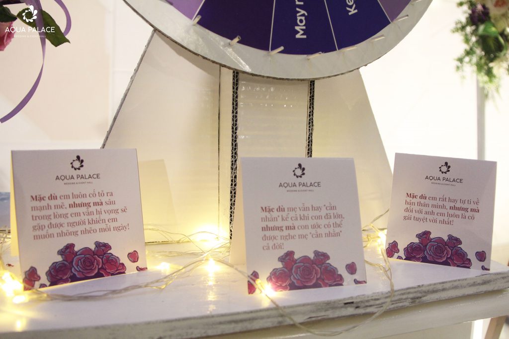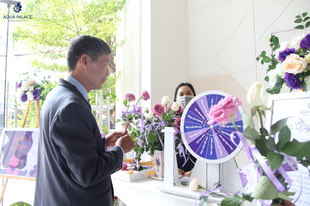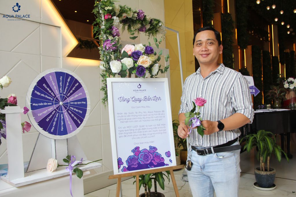 Cũng như Aqua Palace, ‘’phái mạnh’’ nhanh chóng bày tỏ yêu thương đến những người phụ nữ quan trọng của mình qua trò chơi VÒNG QUAY BẢN LĨNH. Với những món quà đáng yêu nhưng không kém phần tinh tế như: kẹo ngọt ngào, thiệp yêu thương, sổ hoa xinh và đũa Nhật Bản đã nhanh chóng chiếm lấy trái tim của các khách mời. Tại đây ‘’cánh mày râu’’ sẽ thỏa sức thể hiện để đem về những phần quà cho nửa kia.