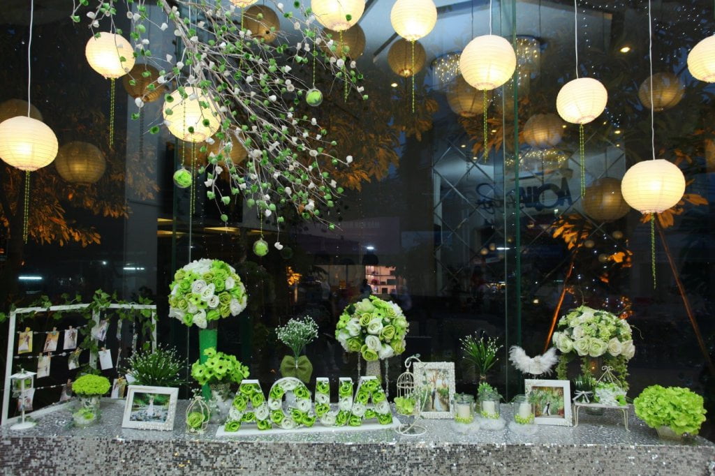 Toàn bộ không gian nhà hàng từ văn phòng, sảnh chính, sảnh tiệc, hành lang cho đến các cầu thang và lối đi đều được chăm chút tỉ mỉ công phu với hơn 90% cây thật để tạo nên một không gian xanh miên man, xanh bất tận, tạo sự thanh thoát, hài hòa và dễ chịu. Gam màu xanh mát, trẻ trung và năng động sẽ tiếp thêm niềm hứng khởi, thổi một làn gió thanh xuân vào ngày vui trọng đại của đôi bạn.
