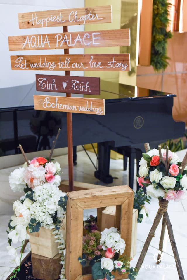 Sáng tạo là tôn chỉ hoạt động của Aqua Palace. Trong tiệc cưới anh Tịnh, chị Tình, bàn tân chúc gây ấn tượng đầu tiên đến khách hàng. Trên mặt bàn là những tấm hình, phụ kiện trang trí nhỏ xinh và hoa tươi, phía trên bàn tân chúc là dreamcatcher làm bằng lông vũ. Những điều này mang đến cảm giác ấn tượng cho khách dự tiệc, trở thành chốn check in độc lạ cho mọi người tham dự.